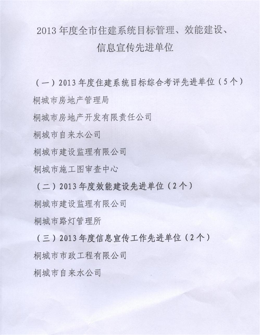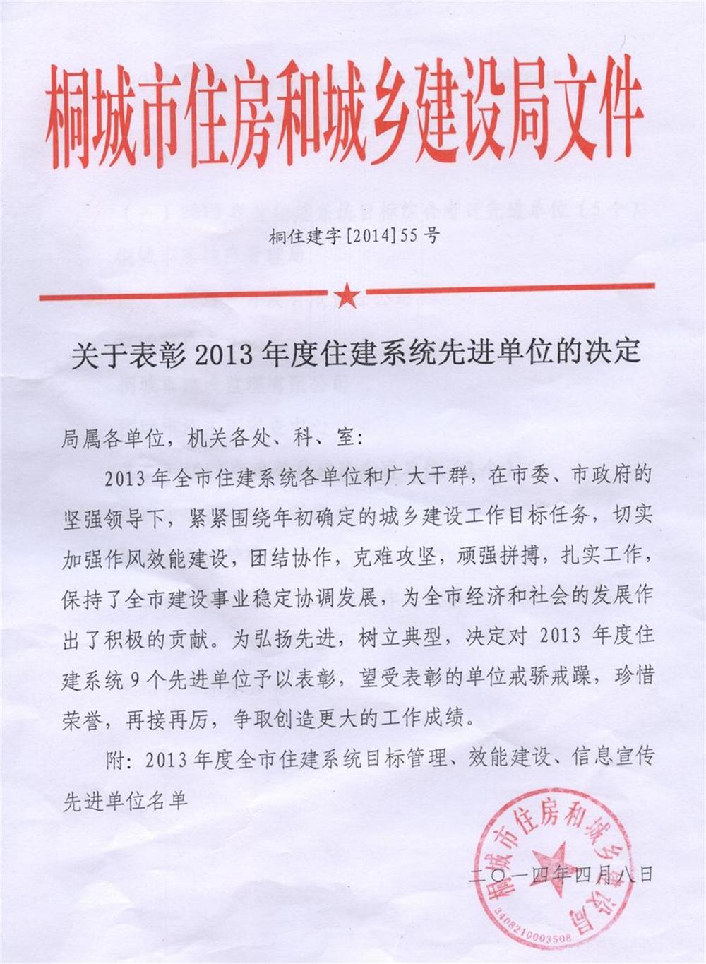 热烈庆祝我公司荣获“2013年度住建系统目标管理、效能建设先进单位”荣誉称号