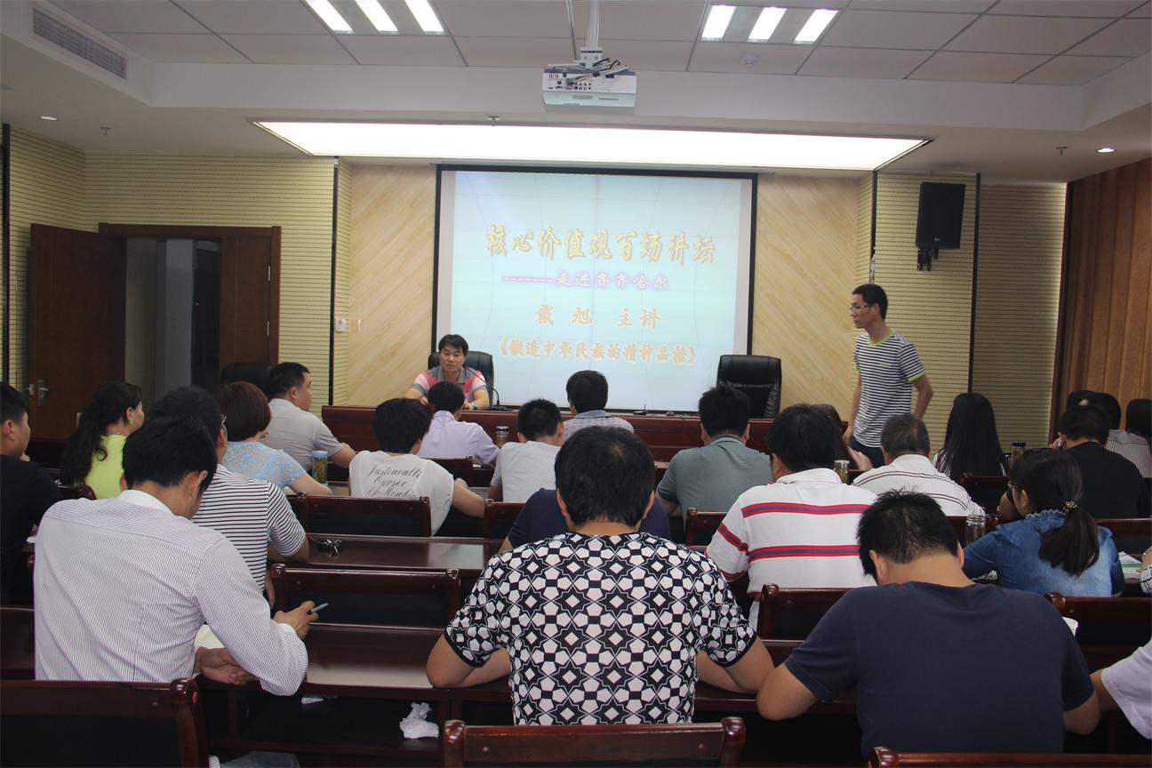 演讲开始前,公司总经理汪海元同志带领大家共同学习了社会主义核心价值观的24字核心内容,戴旭同志的简单介绍、个性特点、社会影响力和社会对他的评价。随后,通过视频,我们跟随戴旭教授从历史角度出发,深入分析了甲午战争失败和抗日战争胜利的原因,回忆了同一个战争舞台上,同一个对手,不同时空的两次生死决战,将历史与现实相结合,讲述中华民族的精神所在,深层次挖掘了社会主义核心价值观的具体内容。