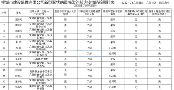 2、做好人员排摸工作,对近期从武汉回桐人员在公司员工中进行全面覆盖排摸,了解其基本情况,建立人员清单。