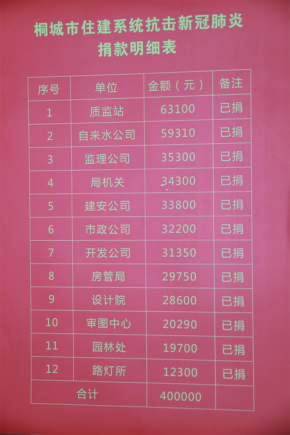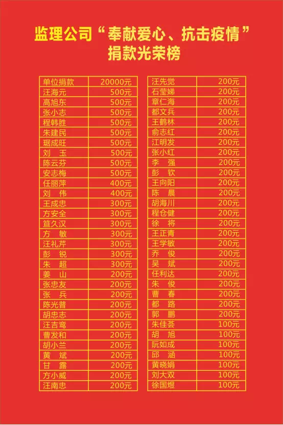 2月10日,接上级主管部门关于“汇聚住建爱心,助力抗击疫情”的爱心捐款倡议后,市监理公司广大员工积极响应,纷纷解囊,通过微信转账等方式,仅用三个小时时间就筹集了资金3.53万元,其中公司61位员工捐款共计1.53万元,单位2万元由住建局统一捐往桐城市红十字会用于此次疫情,为疫情防控阻击战贡献了我监理人的一份力量。