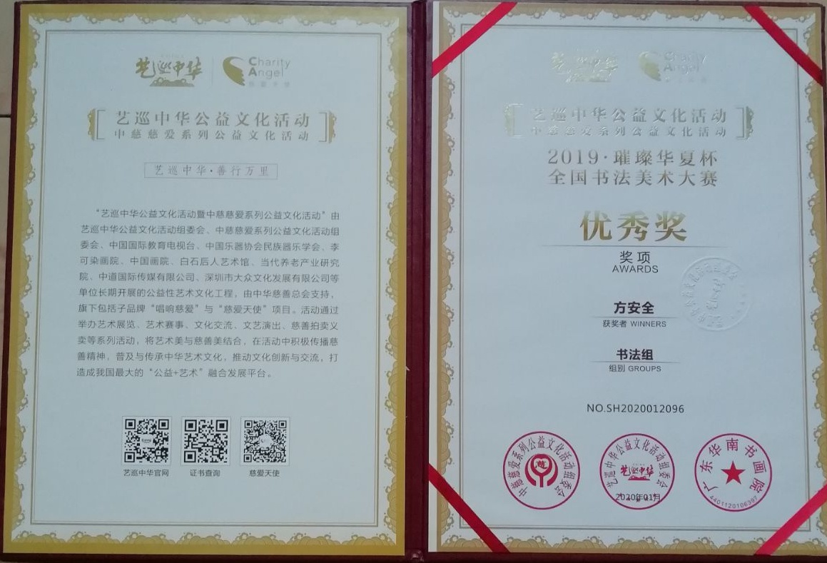 书香润智,翰墨养德。书写经典,传承国粹。热烈祝贺我公司总监方安全同志在参加的“璀璨华夏杯”全国书画大赛中经过激烈的网络投票、初赛、决赛,最后顺利进入专家评审,荣获2019年.璀璨华夏杯全国书法美术大赛优秀奖。