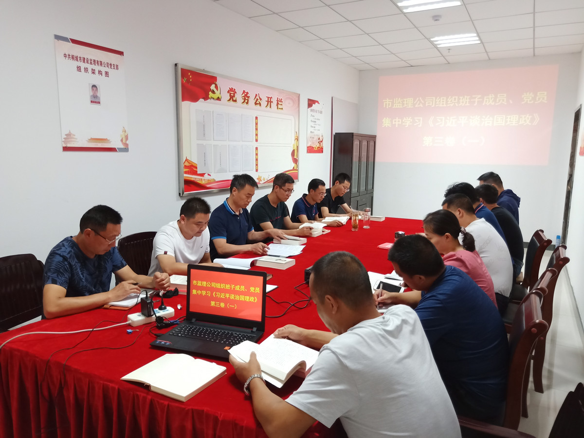 2020年7月24日,党员活动室里市监理公司班子成员、党员干部围桌而坐,在公司总经理汪海元的领读下,认真学习领会《习近平谈治国理政》第三卷中关于十九大报告——决胜全面建成小康社会,夺取新时代中国特色社会主义伟大胜利的重要会议精神。