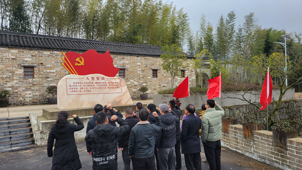 在位于蒋潭村的桐怀潜第一次党代会旧址,党员干部们认真聆听解说员的介绍,1940年2月25日至27日,中共桐怀潜中心县委在此召开了第一次党代表会议,这次会议不仅对击退国民党反动派的反共高潮,也是党领导桐城地区抗日斗争的一个历史转折点。大家沿着展厅长廊认真参观文化墙上记载的革命斗争史,集中观看了《星火燎原-桐城革命史纪事》记录片。大家静静聆听,认真观看,追忆着革命前辈的英雄事迹。在“入党誓词”石壁前,党员们面对党旗,举起右手,重温了入党誓词。