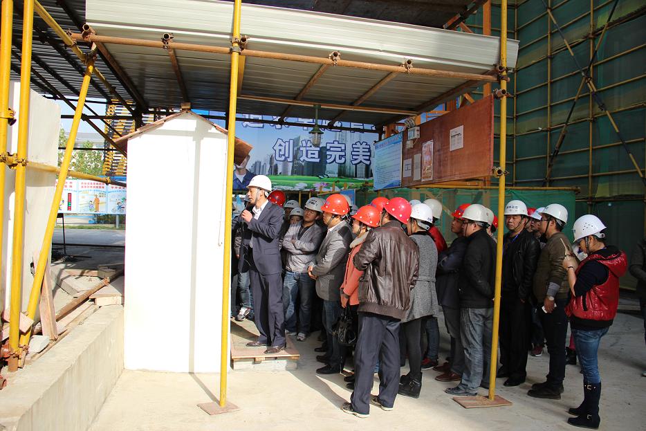 在张小志同志的详细讲解中,参摩人员了解了该工程施工单位对工人安全教育的模式、施工现场进出口、施工围栏、脚手架搭设、配电箱设置、塔吊零扣件和临时生活区搭建等现场设置情况。